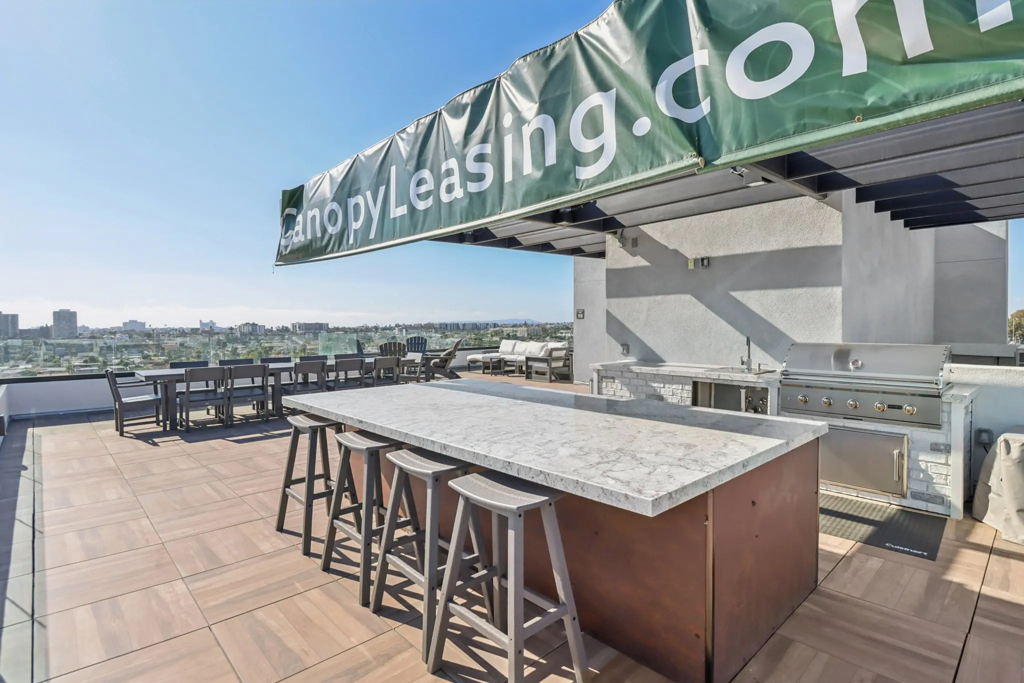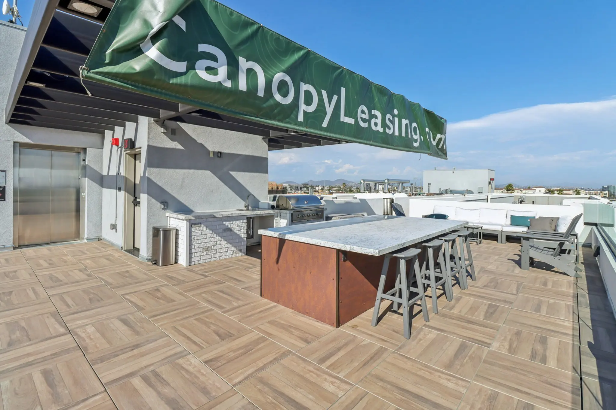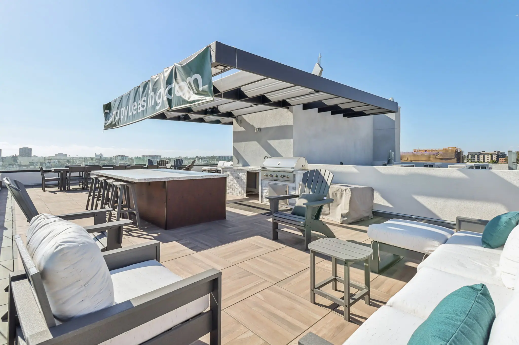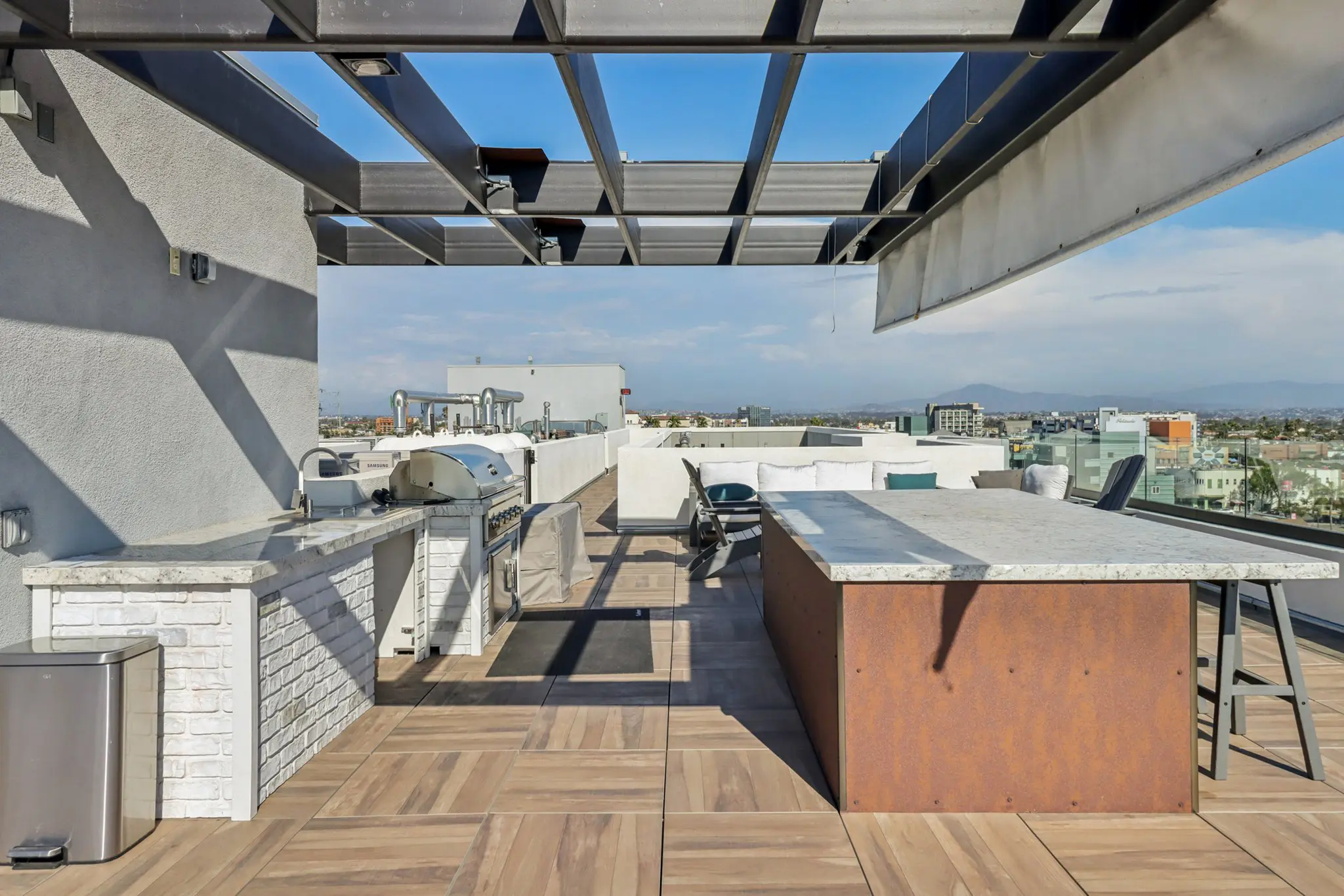 Designed for both relaxation and social gatherings, the rooftop features multiple seating areas ideal for lounging, entertaining, or savoring a quiet morning coffee above the neighborhood. A built-in barbecue and island setup makes outdoor dining effortless, setting the stage for casual cookouts and memorable evenings with friends. Whether you’re soaking in skyline vistas, catching an evening breeze, or simply enjoying the open sky, the rooftop terrace offers a true escape right at home.